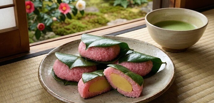 椿餅は「つばいもちい」として源氏物語にも登場し、若菜上の中で蹴鞠を終えた若者たちが口にする場面が描かれています。なお、この「つばいもちい」は、見た目は現在の椿餅に似ていても、あんは入っておらず、味は異なるものであったと考えられています。