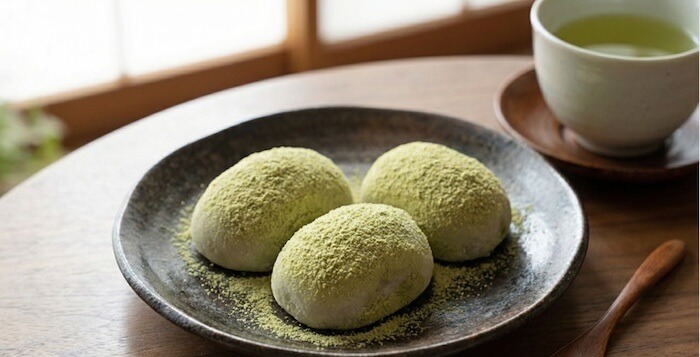 あんを餅で包み、青きな粉(青大豆の粉)をまぶしたもので、両端を少し尖らせた楕円形をしています。